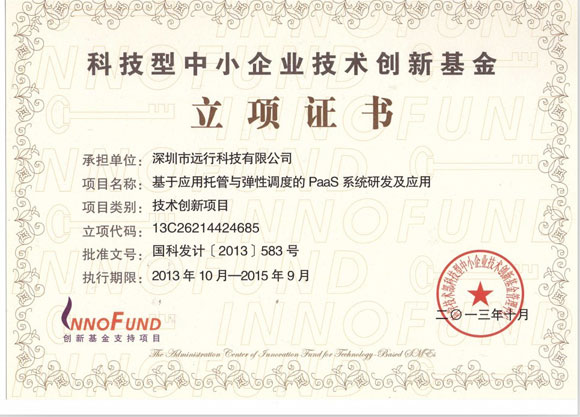 2013年9月,遠行科技的"基于應用托管與彈性調度的PaaS系統研發及應用"項目(立項代碼:13C26214424685),獲國家科技部2013年技術創新基金資助,得到了國家科技部的高度認同。