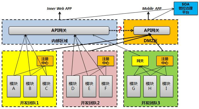 4. 對(duì)于開(kāi)發(fā)團(tuán)隊(duì)內(nèi)部,如果考慮和Docker容器的進(jìn)一步自動(dòng)化集成,可以考慮在內(nèi)部先啟用微服務(wù)網(wǎng)關(guān),再將微服務(wù)網(wǎng)關(guān)開(kāi)發(fā)的API地址進(jìn)一步注冊(cè)到外部的API網(wǎng)關(guān)上面。