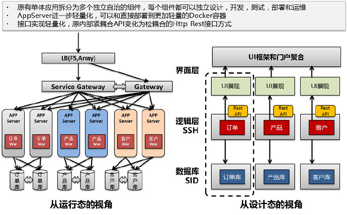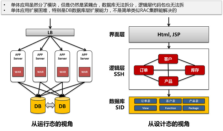 很多單體應(yīng)用有時(shí)候也在強(qiáng)調(diào)是基于組件化和模塊化的開始思路開發(fā)的,或者說是基于SOA架構(gòu)開發(fā),那從運(yùn)行態(tài)和設(shè)計(jì)態(tài)分別來(lái)看的話可以看到。