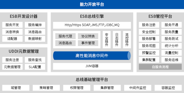 遠行ESB服務(wù)總線基于主流高性能消息中間件和規(guī)則引擎自主研發(fā),包括ESB開發(fā)設(shè)計器,消息中間件和ESB總線引擎,服務(wù)全生命周期管理和能力開放平臺。