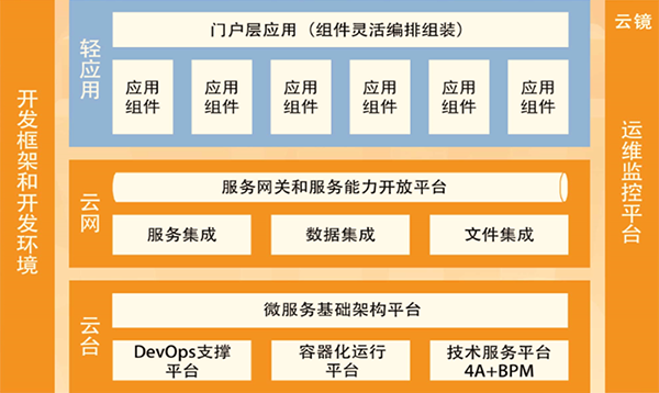 為企業構建完整的技術中臺架構體系,為業務中臺微服務提供完整能力支撐,包括容器PaaS云平臺,DevOps過程支撐平臺,技術服務平臺和API網關和大數據集成平臺,同時提供完整的開發環境和運行監控環境。