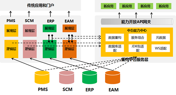 在構建新的中臺能力服務層的時候,為了對已有的遺留系統影響最小,給出通過適配和定制的方式來對中臺層進行重構: