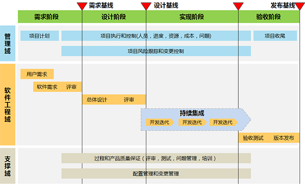 參考主流的CMMI過程模型和Scrum敏捷方法論,為企業構建一套研發過程質量管控標準規范體系, 實現軟件產品的持續集成和敏捷交付能力。